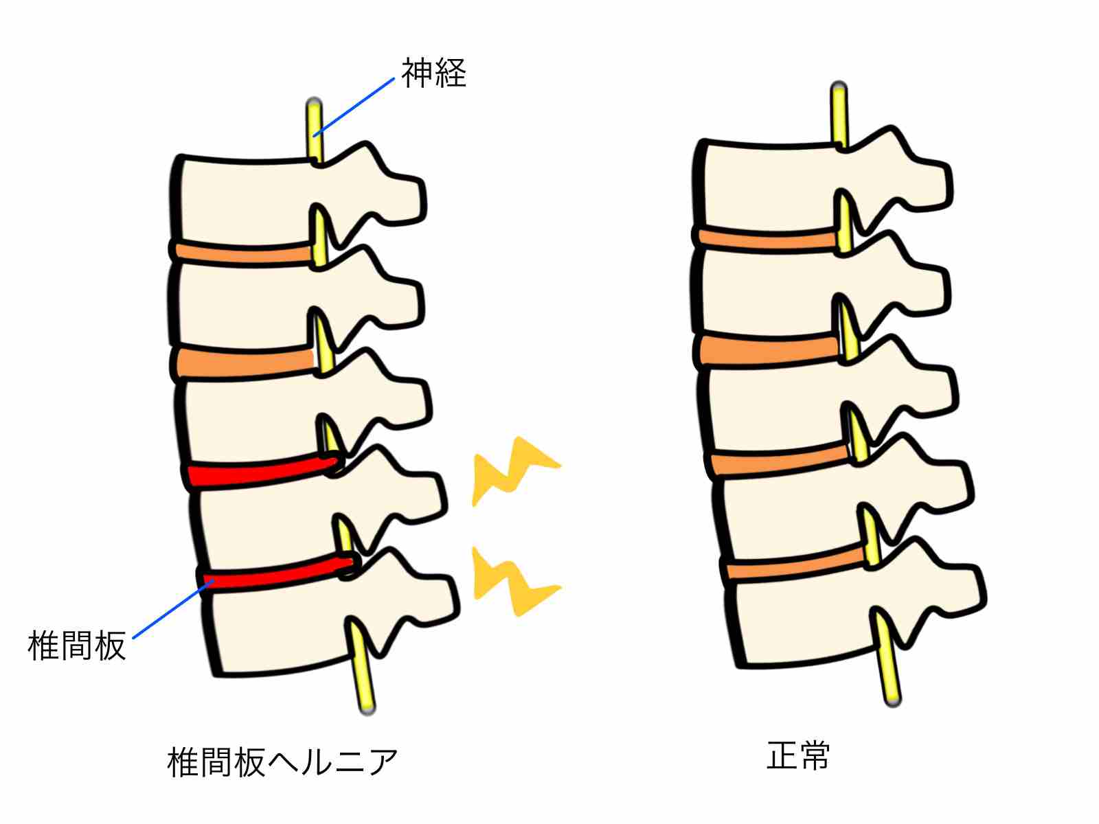 こちらのイラストは腰椎(腰のほね)のイラストになるんですが右は正常で左は軽度のヘルニアの図になっています。