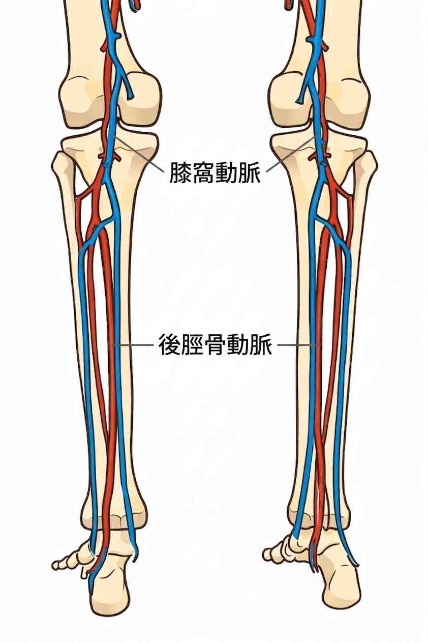 膝の後ろからふくらはぎにはイラストのような膝窩動脈、静脈、後脛骨動脈や静脈などが通りその周りにはイラストのような膝窩筋や後脛骨筋、長趾屈筋などが付きます。