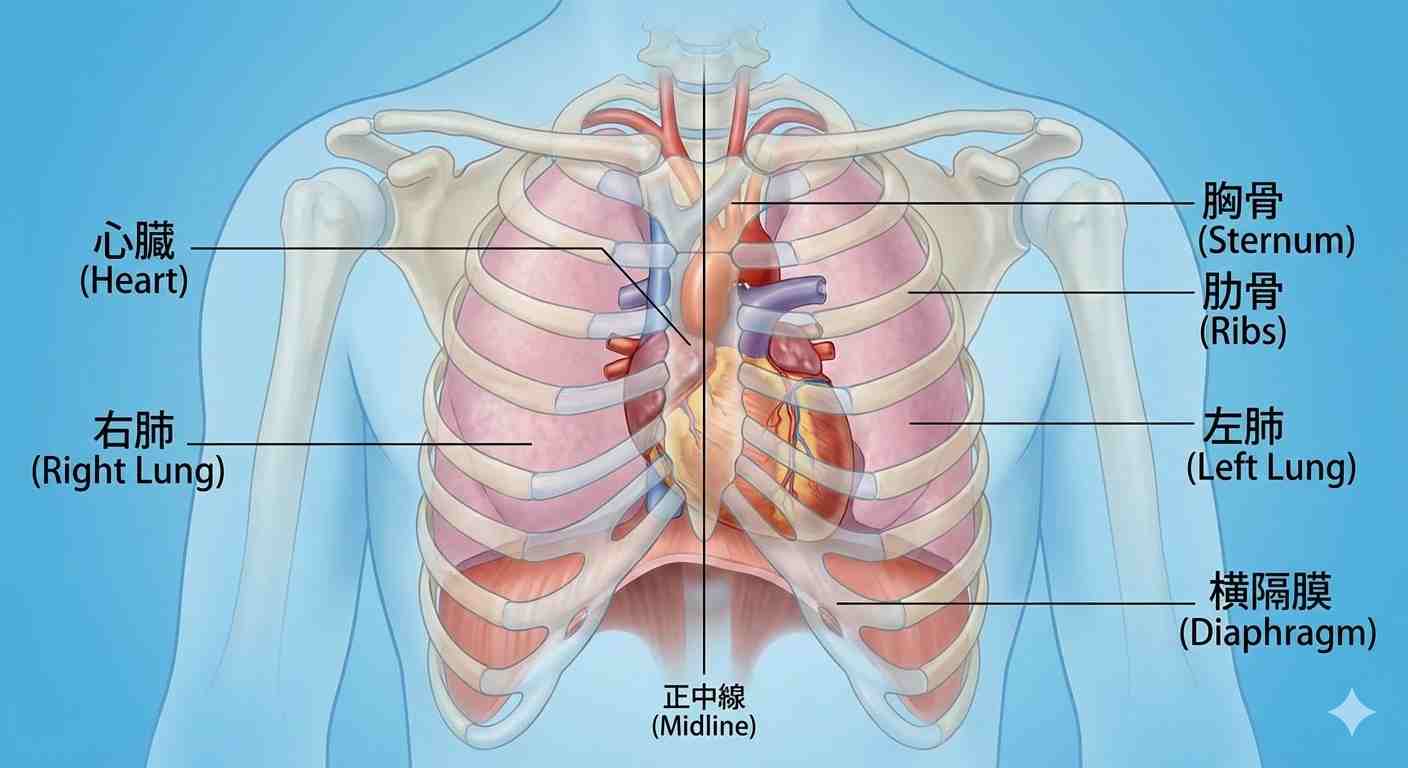 心臓は胸の前から見て、第2~6肋骨の胸骨の高さにあり胸骨(胸の真ん中の骨)から幅2、3センチ離れた位置まであります。