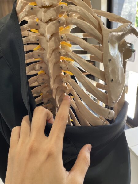 まず最初に今回の腹痛の1番の原因だと推測できた背中の起立筋群のほぐしをします。特に腰椎の1,2番付近ですね。
