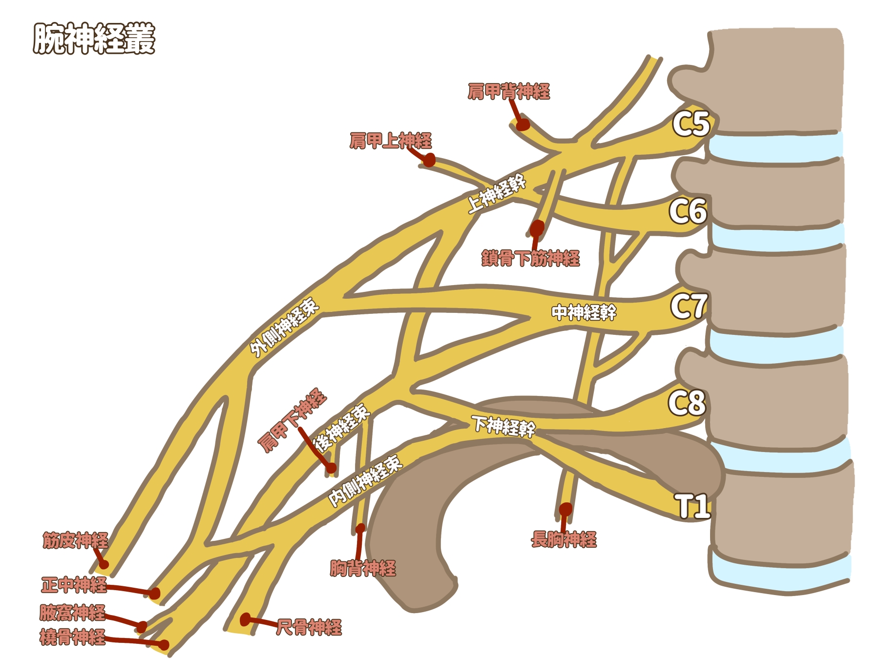 一応神経自体はこんな感じになっていて首の神経のイラストの左下をご覧ください。正中神経や筋皮神経、尺骨神経などは前腕までつながる神経になります。